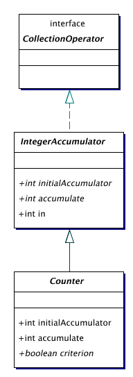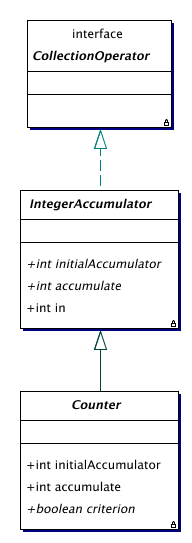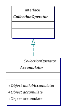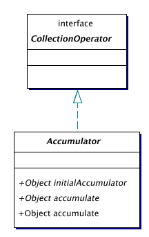 | Accumulator | A class of objects that accumulate over a collection.  The Accumulator class is the general class for visiting a collection