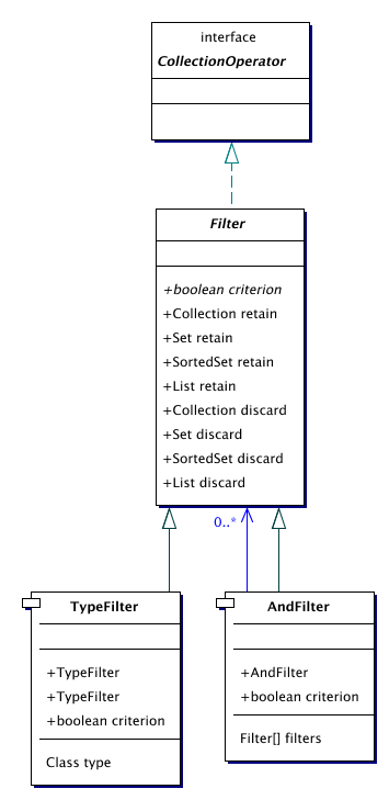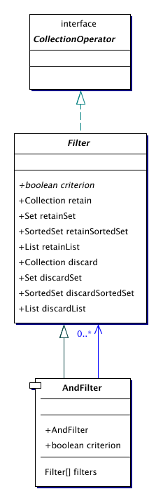 Filter is the top class of the filters that operate on collections. It implements the retain and discard methods. The criterion must be defined by subclasses.