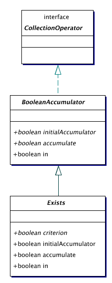 | Exists | A boolean exists operator.  A convenience accumulator of collections that checks whether some