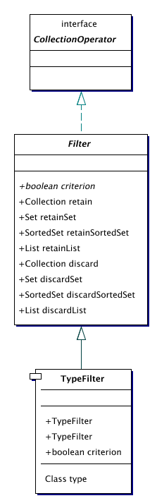 | TypeFilter | A class of filters that use the type of an object as criterion.  This filter uses the type of elements of the filtered collection as criterium. |