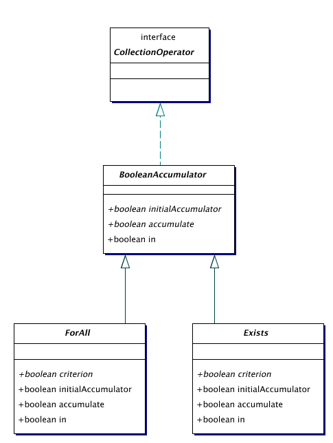| CollectionOperator | CollectionOperator is the toplevel interface for collection operators. To be able to prove the correctness of a subclass, a model method is provided which acts like an abstract precondition for methods that operate on the elements of collections. Collection operators are typically used as anonymous inner classes, in which case some assertions are known to be true for the collection. |